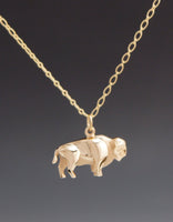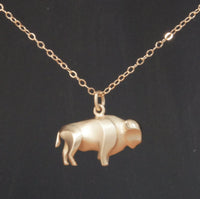 .  this the same as the silver buffalo but in low tarnish bronze  1" long and 1/2 " tall. this guy is solid.  comes with 18"   14 k gold filled chain or you can get it as a charm  the satin version has a  sand blast finish on the cape  and belly .  the polished version is polished  everywhere