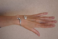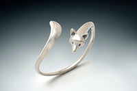 this is the matching bracelet for the fox ring and pendant. satin finished with one side of the tail polished and polished ears and nose. comes with blue or pink sapphire, green garnet (tsavorite) or ruby. this bracelet can be adjusted to fit your wrist and please supply your wrist size. my wife likes to wear it a bit down on her hand like in the photo but you can wear it wherever ,...